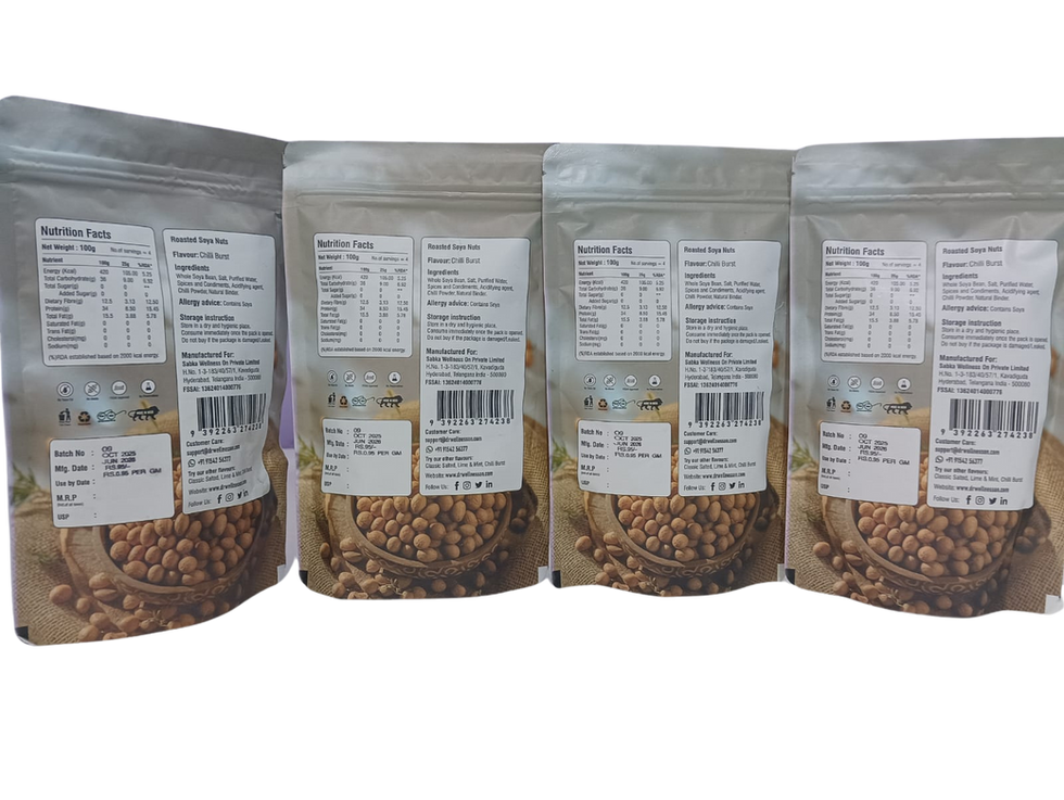 Snack on Roasted Soya Nuts Chilli Burst as a spicy, protein-packed treat during your workday, at the gym, or during movie time. You can also sprinkle them over salads or soups for an extra punch of flavor and crunch.
