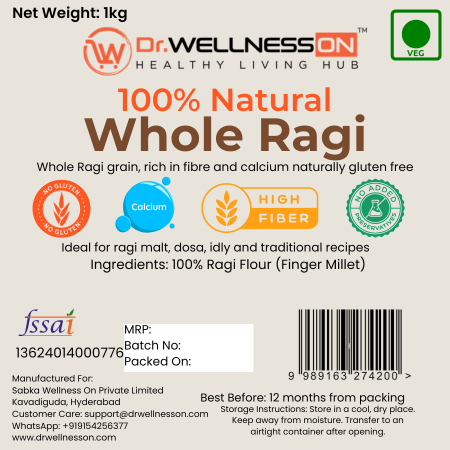 Whole Ragi (Finger Millet) - 1kg is a nutrient-dense grain known for its rich calcium, fiber, and antioxidant content, making it an excellent choice for maintaining a balanced diet. At dr.wellnesson, we prioritize your health by offering this whole grain in its purest form, supporting digestive wellness and sustained energy release. Perfect for gluten-free diets and versatile in various recipes, Whole Ragi is a natural way to enhance your meals while promoting overall well-being. Trust dr.wellnesson to provide high-quality, wholesome ingredients that align with your health goals and lifestyle. Incorporate Whole Ragi into your routine for a nourishing boost that complements our commitment to your wellness journey.